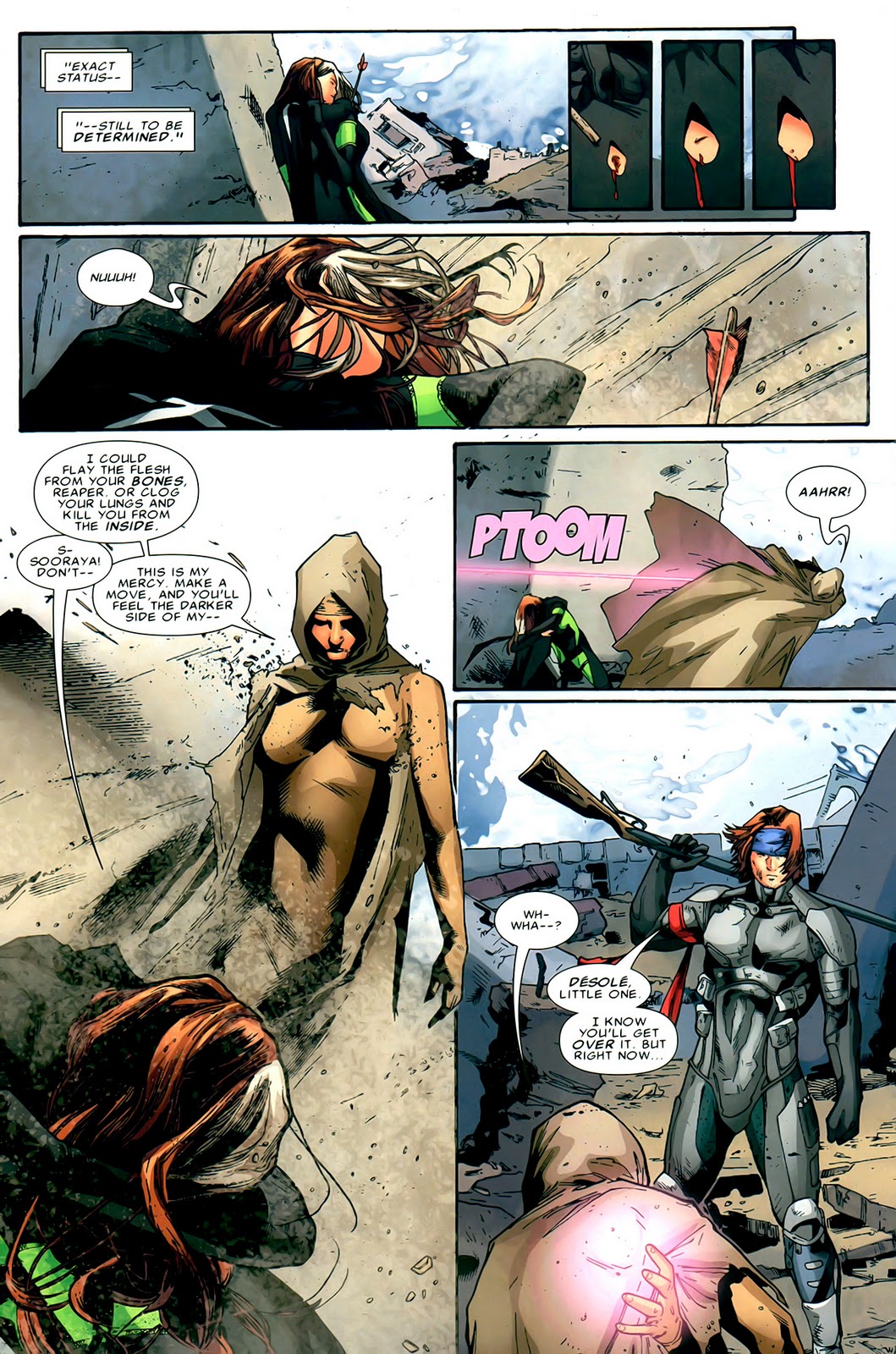 เลกาซี่ ถอนธนูออก บาดแผลของเธอค่อยๆสมานตัว ( เธอน่าจะดูดพลังของวูล์ฟเวอรีนมา ) แต่ทรายที่เกาะเธอมาและรอบๆ ก่อตัวกลายเป็น ดัสท์