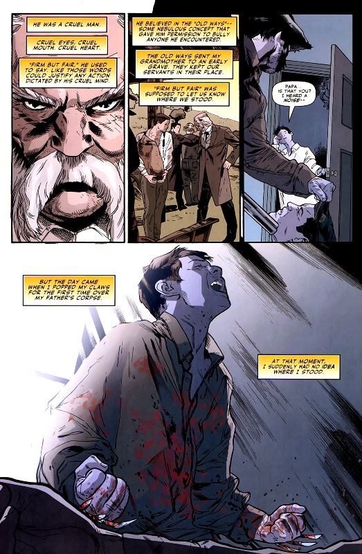 หลังจากวูล์ฟเวอรีนแสดงพลังออกมาเป็นครั้งแรก เขาฆ่าพ่อที่แท้จริงของตัวเอง ซึ่งเป็นทาสที่ลักลอบเป็นชู้กับแม่ของเขา เขาหนีออกจากคฤหาส ด้วยความช่วยเหลือของสาวใช้ชื่อ โรส และ เป็นปู่ที่โหดเหี้ยมของเขาเสนอความช่วยเหลือให้หลบหนีตำรวจไปได้ แต่ทั้งหมดที่วูล์ฟเวอรีนจำได้คือ ดวงตาอันโหดร้ายของปู่